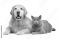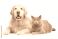• Golden Retriever dog and British Shorthair cat lying together, isolated on white transparent background.