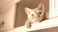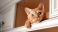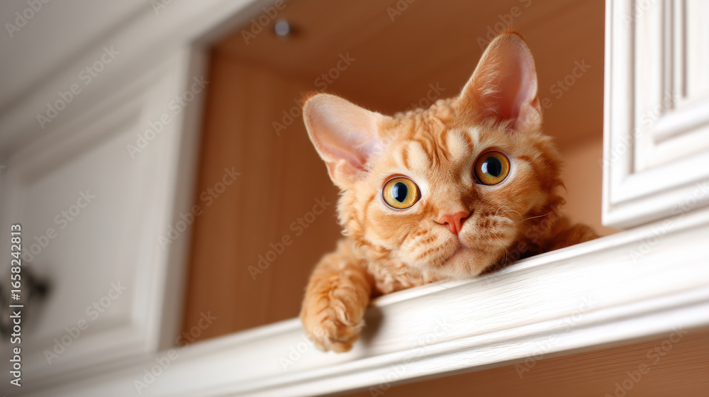 • curious orange cat peeks out from a high shelf, showcasing its large eyes and fluffy fur, embodying playful curiosity.