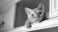Koty - curious orange cat peeks out from a high shelf, showcasing its large eyes and fluffy fur,... #1658242813