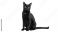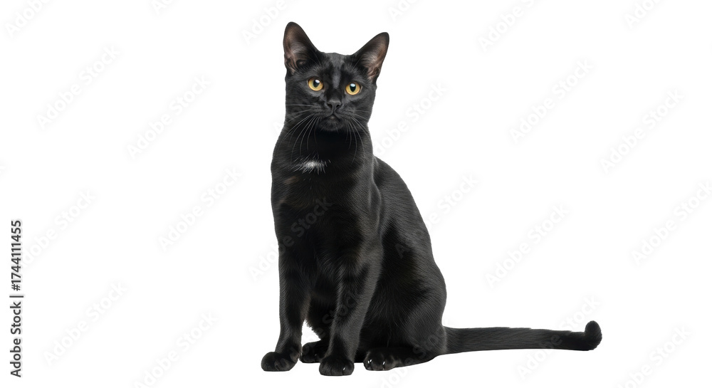 • Isolated graceful sleek black cat with yellow eyes, sitting still looking at viewer intently