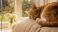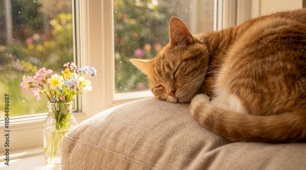 • Ginger cat sleeping peacefully on a cushion next to a vase of wildflowers on a sunny spring day