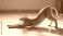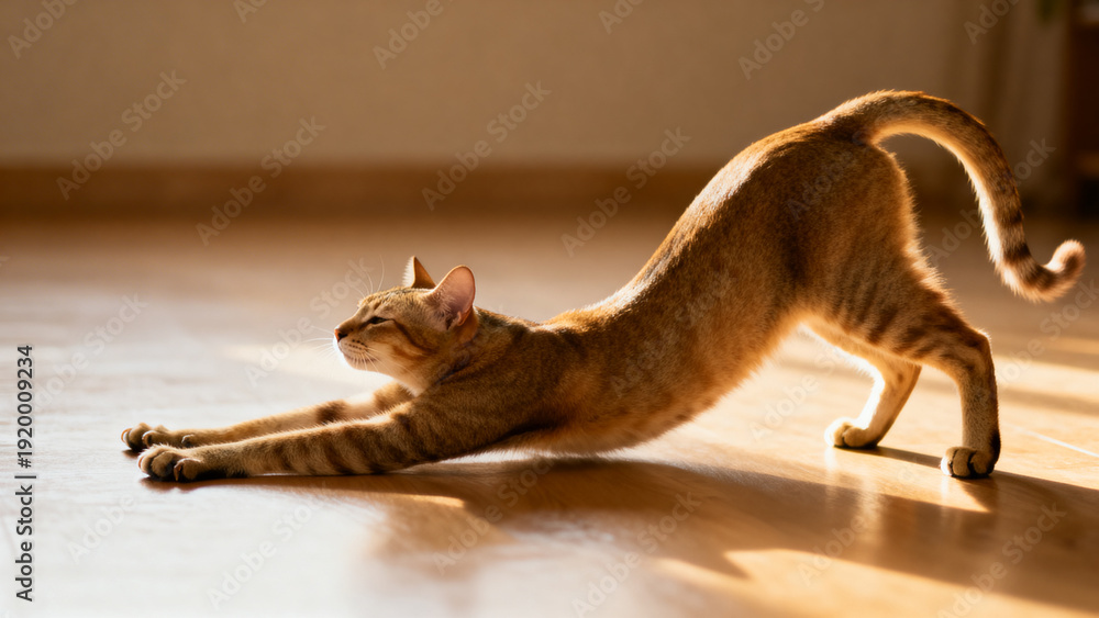 Koty - Orange cat stretching on wooden floor in sunlight at home #1920009234