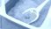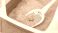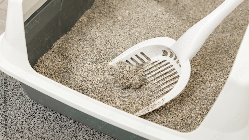 • Cat litter box with gray sand and white scoop, showing a clean and organized pet care environment for indoor cats