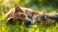 • Cute dog and cat lying together on a green grass field nature in a spring sunny background