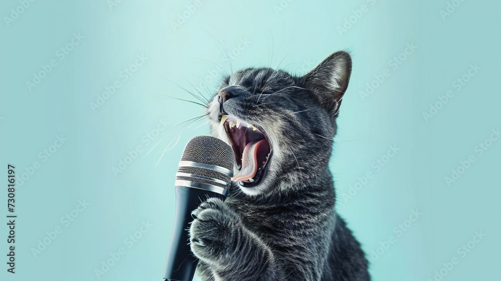 Koty - Funny emotional cat singing into the microphone. Copy space background #730816197