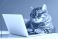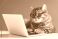 • Cute tabby cat with spectacles appears to use a laptop, representing humorous anthropomorphism