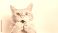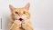 • A yellow tabby cat looking scared with its paws on its face. White background.