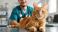 • Red furred cat being examined by a male veterinarian in a veterinary clinic