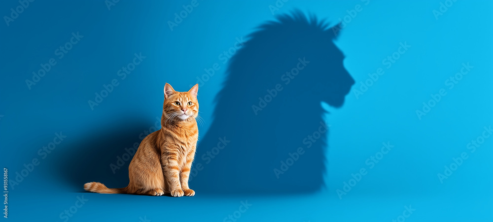 Koty - An orange cat sitting on a blue background with the shadow of a lion cast behind it #931558167