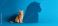 • An orange cat sitting on a blue background with the shadow of a lion cast behind it