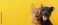 • Vet banner with pets and copy space for text. Dog and cat smiling with happy expression and closed eyes. Isolated on yellow background