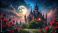 • Beneath a moonlit sky, an enchanted gothic castle rises, dark roses flourishing around it, while a mysterious beast lurks in the shadowed night.