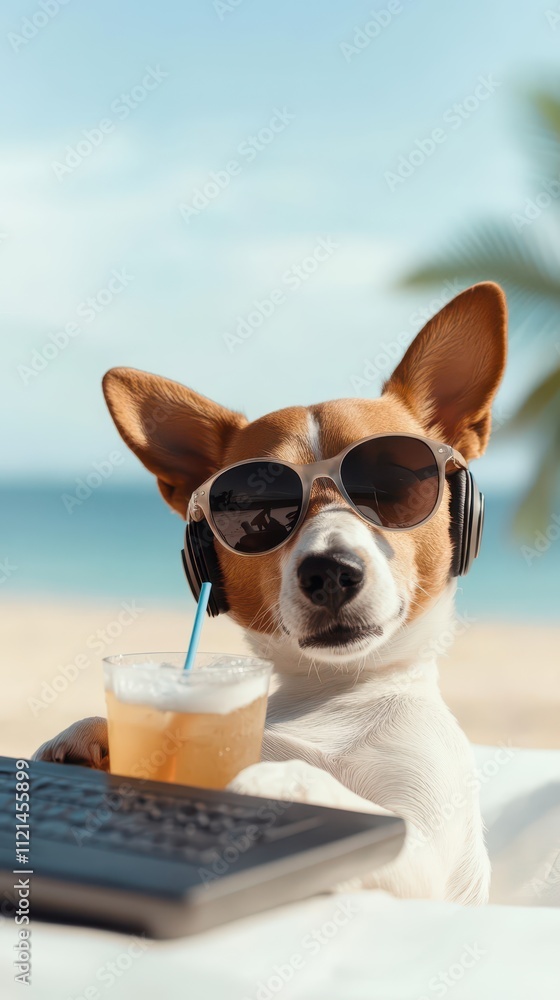 • Dog relaxes on beach lounger while enjoying a tropical drink in sunny weather