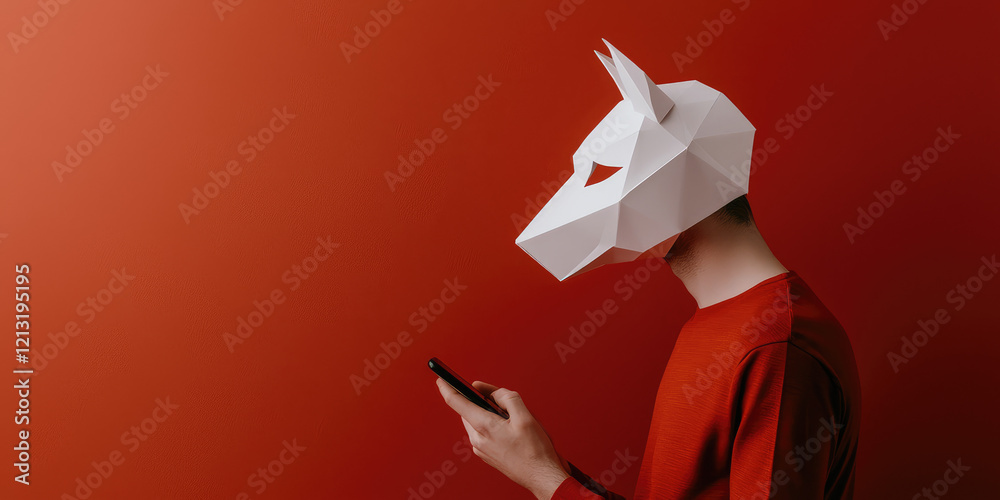 • Man dressed wild animal paper mask typing on phone. Creative concept of anonymity in social networks, haters, commentators