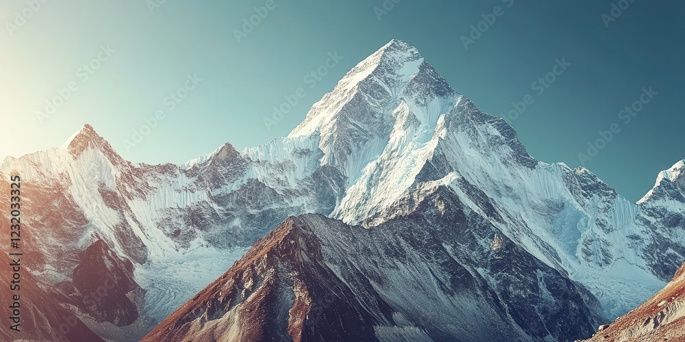 • Stunning view of majestic snow-capped mountain peaks under a clear blue sky.