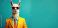 • Elegant llama in orange business suit, sunglasses against bright turquoise background. Funny animal poses like model. Design includes wide banner, copy space for text. Stylish animal boss cool.