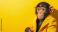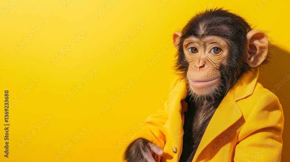 • A cute pan troglodytes monkey portrait wearing business suit costume on simple color wall anthropomorphic studio work fashion modern background with copy space, wild animal advertising yellow poster