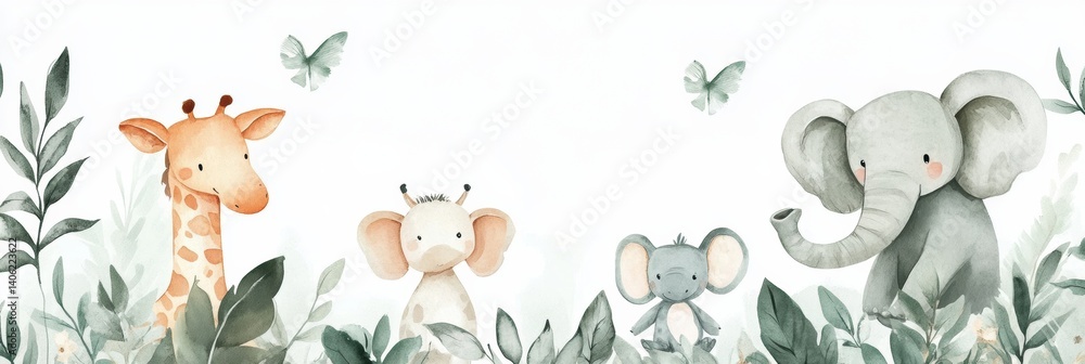 • Soft watercolor jungle animals create a serene atmosphere in a minimal Lapki baby theme nursery design