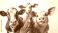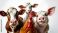 • Group of farm animals including brown and white cow, white calf, pink piglet, and colorful rooster posing together on white background
