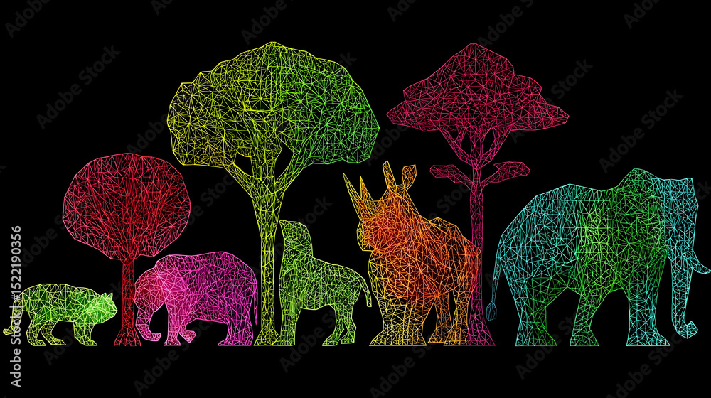 Zwierzęta - forest with neon trees and polygonal animals illuminated by soft ambient light #1522190356