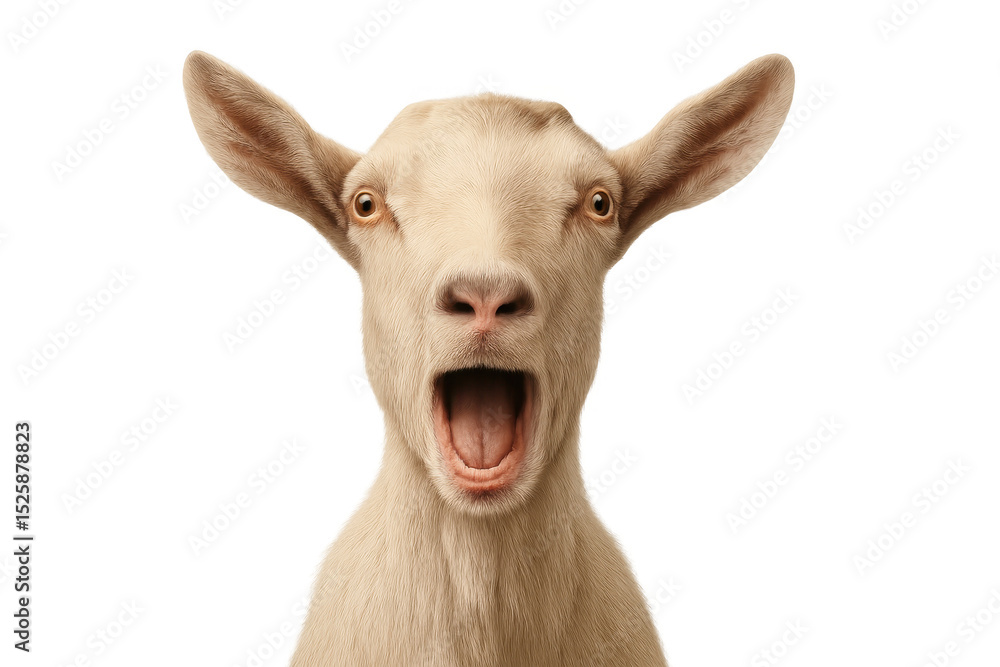 • Goat bleating with wide-open mouth, loud vocal expression against transparent background