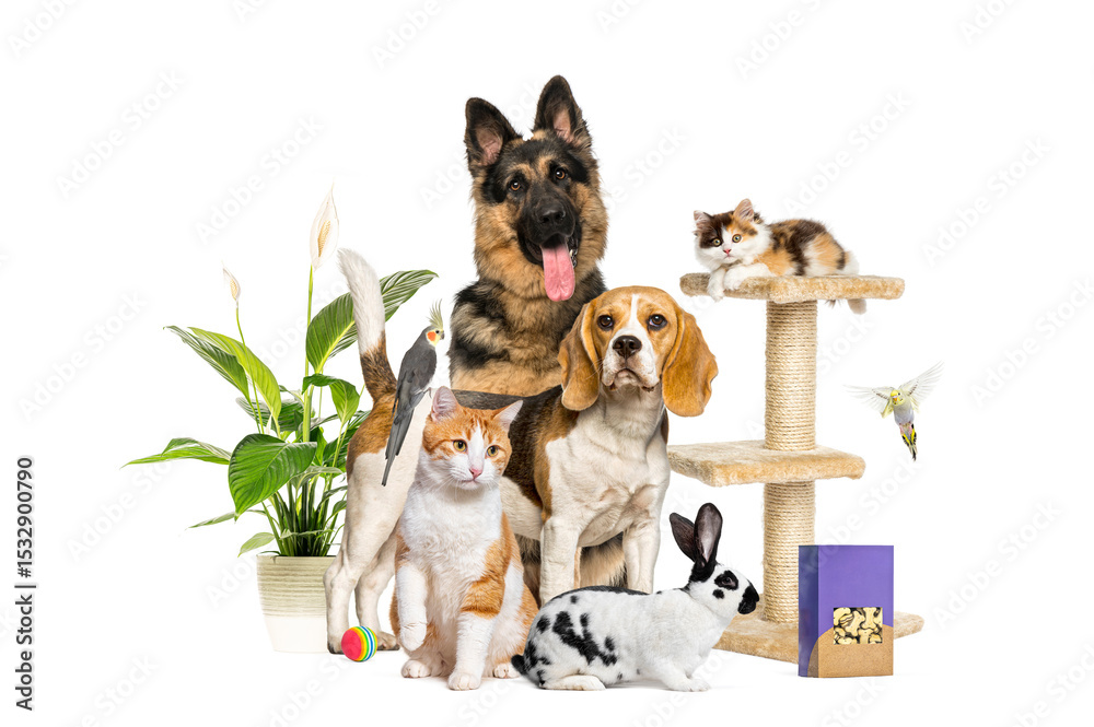 • Large group of domestic animals including dogs, cats, birds and rabbit, posing together with food, plant and tree cat on white background