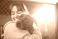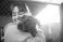 Zwierzęta - Woman smiles while holding black dog close in a sunny outdoor shelter environment. The warm glow... #1569537871