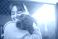 • Woman smiles while holding black dog close in a sunny outdoor shelter environment. The warm glow enhances the affectionate bond. Concept of animal rescue, companionship, pet adoption