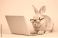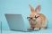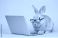Zwierzęta - Funny rabbit wearing glasses works on laptop computer in office. Cute animal typing on keyboard.... #1605454583