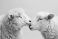 Zwierzęta - Close interaction of two sheep showing affection on plain cream backdrop. composition evokes... #1616276200