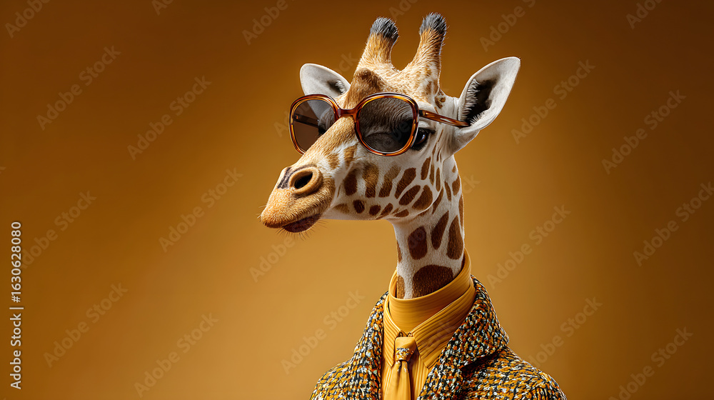 • Fashion giraffe in shades, Cool looking giraffe wearing funky fashion dress - jacket, tie, sunglasses, plain colour background, stylish animal posing as supermodel. Generative AI image