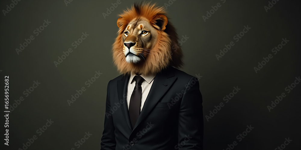 Zwierzęta - Lion dressed in an elegant and modern suit with a nice tie. Fashion portrait of an... #1656952682