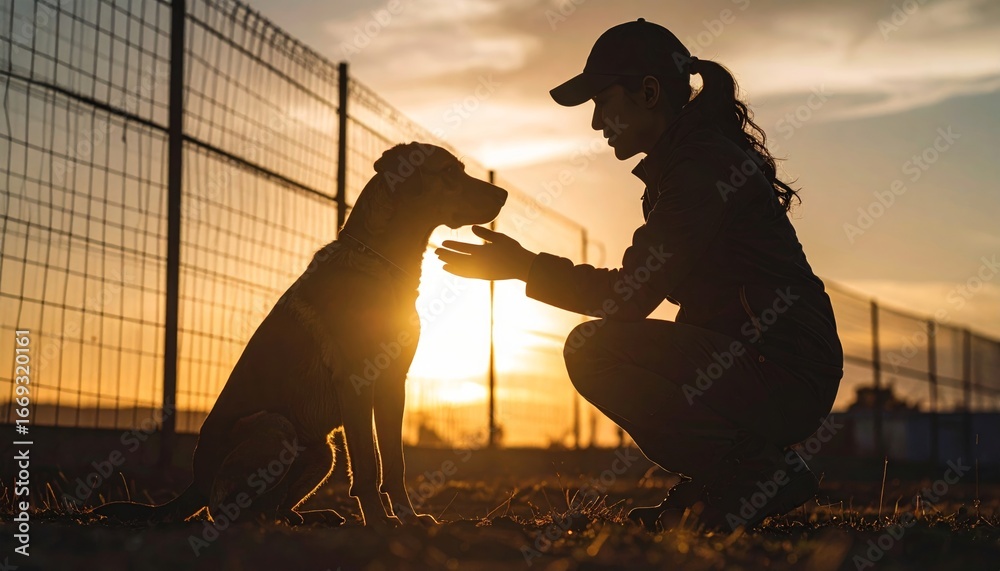Zwierzęta - Woman's silhouette fostering connection with a rescued dog at sunset sanctuary #1669320161