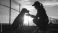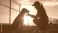 • Woman's silhouette fostering connection with a rescued dog at sunset sanctuary
