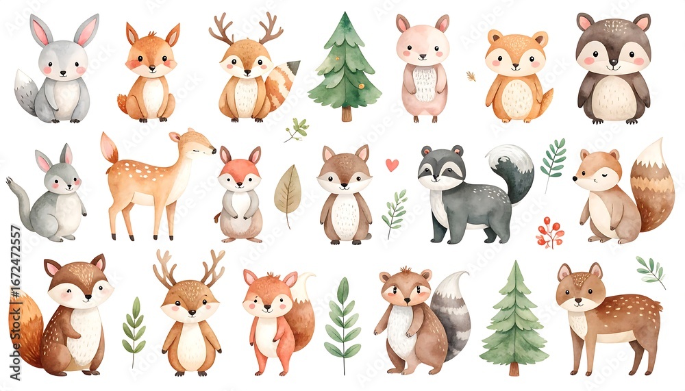 Zwierzęta - Cute woodland animals watercolor set #1672472557