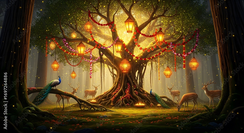 • Enchanted forest tree with glowing lanterns and mystical creatures