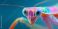 • Extreme close-up frontal portrait of a colorful Praying Mantis with huge turquoise eyes and pink and orange markings expressing direct focus and hypnotic gaze