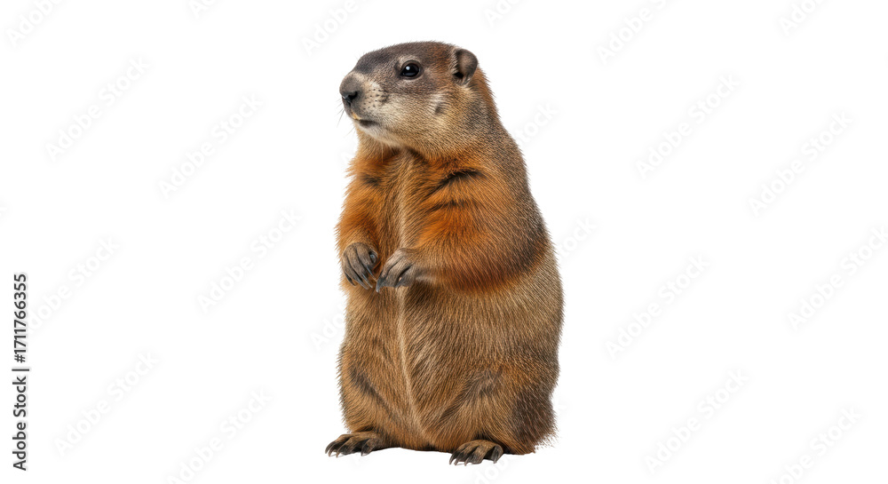 Zwierzęta - Isolated Groundhog Marmot standing up on hind legs, side view on a plain background, animal #1711766355