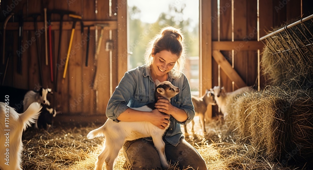 Zwierzęta - Woman embraces a young goat in sun-drenched rustic barn fostering connection and animal care #1716327650