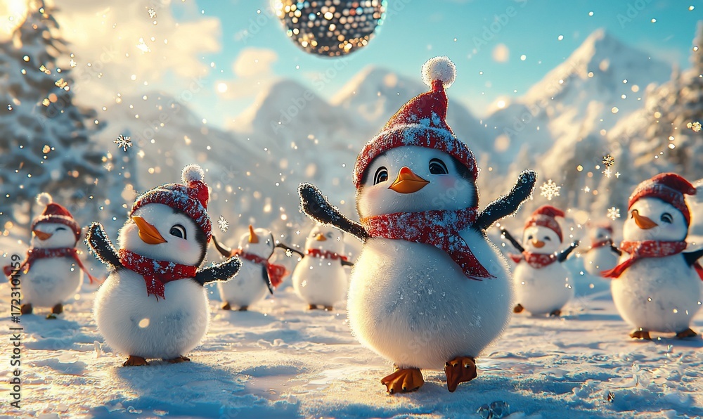 Zwierzęta - Cute penguins dancing in a snowy landscape #1723101159