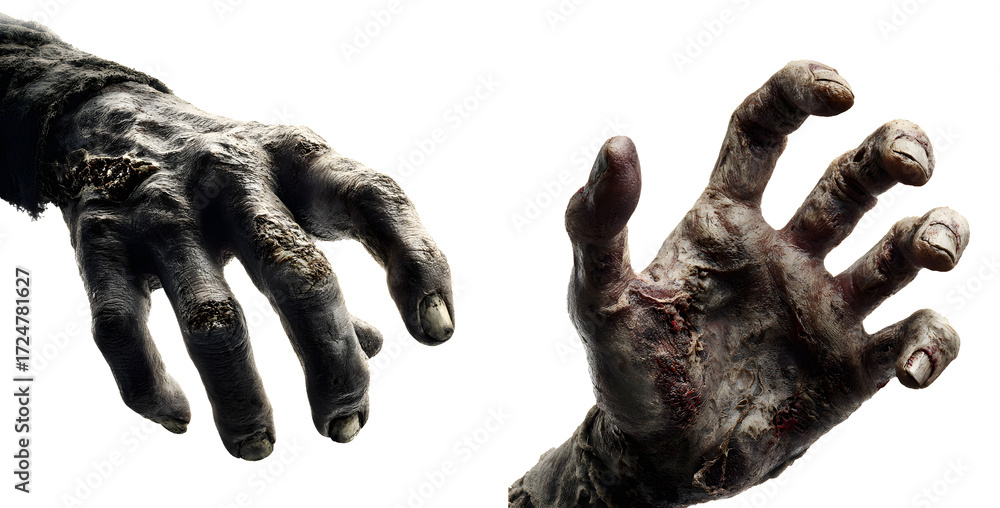 • Zombie hands isolated on white background, horror monster claws cut out on transparent PNG