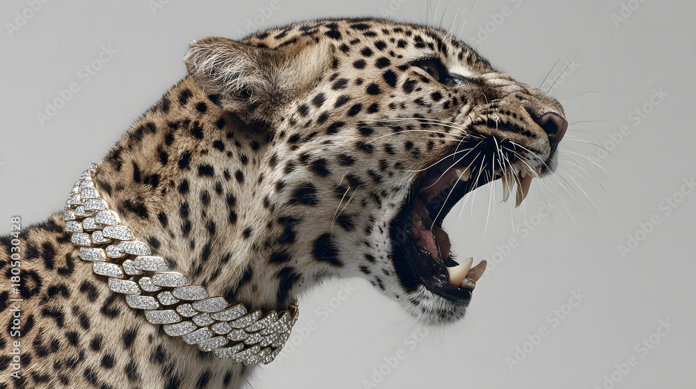 • Close-up of a roaring leopard wearing a stylish silver chain necklace showcasing wild animal power and urban fashion fusion