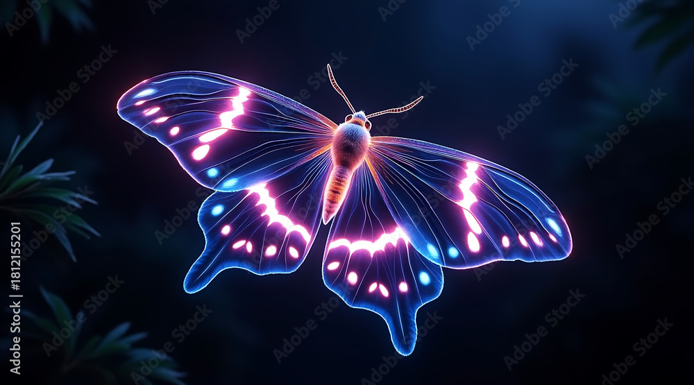 Zwierzęta - Glowing bioluminescent butterfly with vibrant blue and pink light patterns flying in dark natural... #1812155201