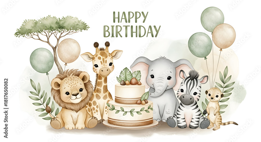 • Cute watercolor safari animals celebrating a happy birthday with cake and balloons, perfect for a child's party.