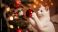 • White cat playing with red Christmas tree ornament. Holiday pet fun concept. Adorable animal enjoying festive decoration for Christmas card.