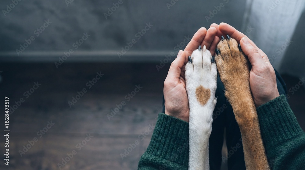 Zwierzęta - Hands holding dog paws in animal shelter, showing compassion #1828473517