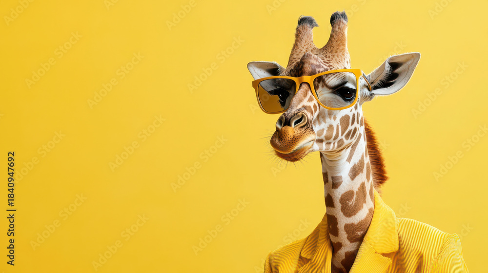 • Fashionable giraffe wearing stylish glasses and bright yellow suit against vibrant yellow background exudes confidence and charm