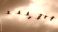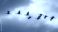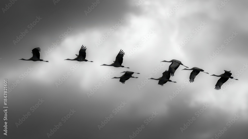 • Flock of cranes flying in formation across a cloudy sky. Bird migration and freedom concept. Black and white nature photography.
