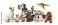 • Group of cute pets on white background. Parrots, dogs, cat, bunny and guinea pig