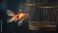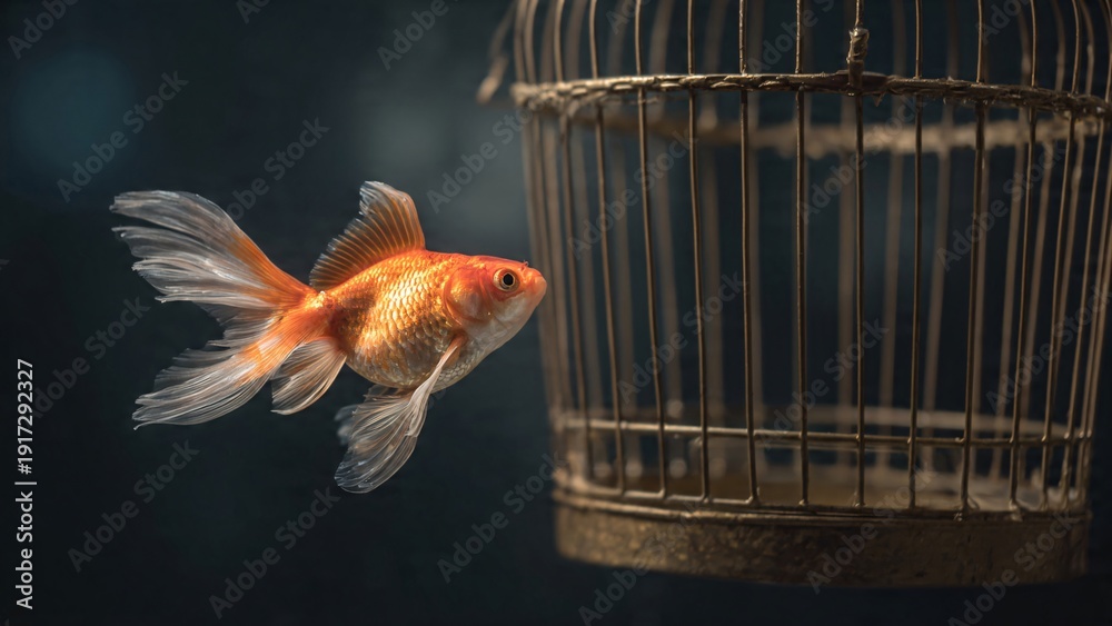 • Surreal Concept Of Goldfish Swimming In Air Inside Vintage Metal Birdcage